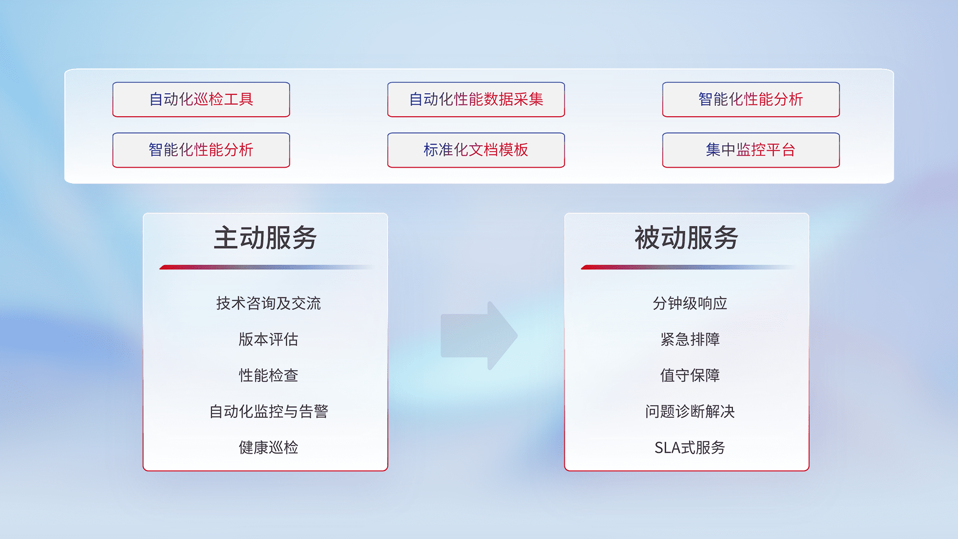 智能化工具和标准化文档,,,,保障服务质量,,提供主动服务(包含技术咨询、、、、版本评估、、、性能检查、、自动化监控与告警、、、健康巡检)和被动服务包含(分钟级响应、、、、紧急排障、、、、值守保障、、问题诊断解决、、、SLA服务)。。。。